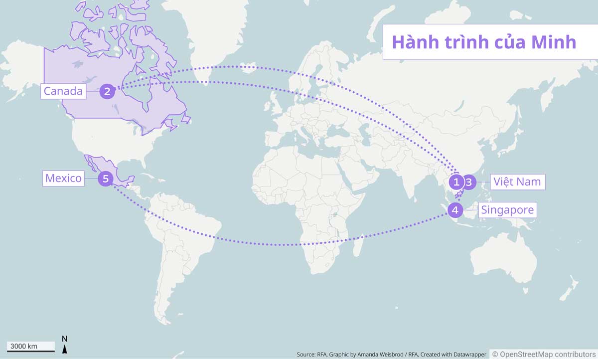 Vào tháng 4/2023, đường dây hướng dẫn anh Minh bay qua Singapore, rồi nhập cảnh vào Mexico bằng visa Canada.