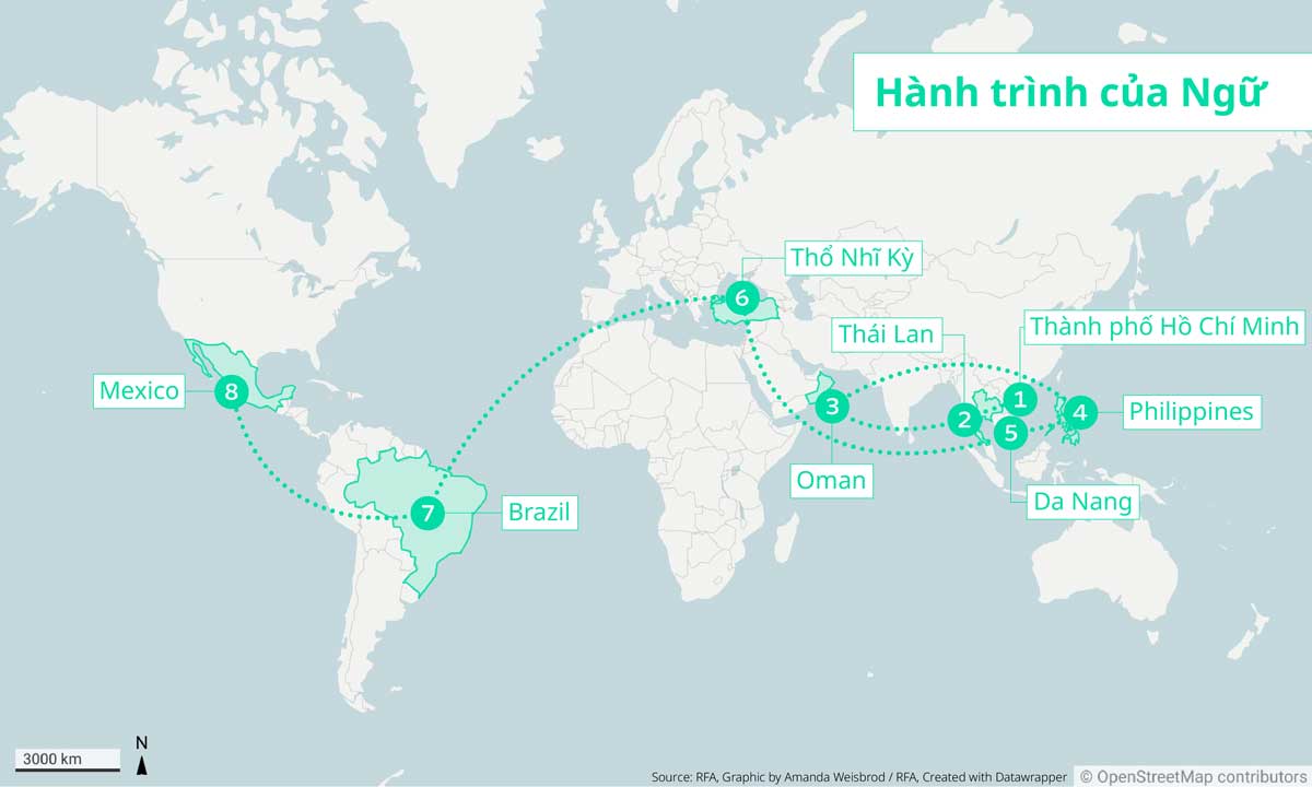 Chuyến đi của anh Ngữ dài 16 ngày với tổng chi phí là 65 ngàn USD. Ngày 10/5/2023, anh bay từ Đà Nẵng qua Thái Lan, rồi từ đó bay đi Oman thì bị từ chối nhập cảnh buộc phải bay lại về Philippines.