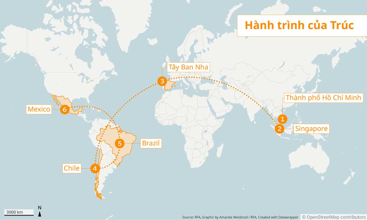 Ngày 10/4/2023, chị Trúc cùng nhóm 3 người nữ khác bay từ TPHCM sang Singapore, tới Tây Ban Nha rồi bay qua Chile; dự tính từ đây sẽ bay sang Mexico. Tuy nhiên, khi cả nhóm đến Chile thì nhận được thông báo của đường dây buôn người rằng “đang bị kẹt” chưa đi được.