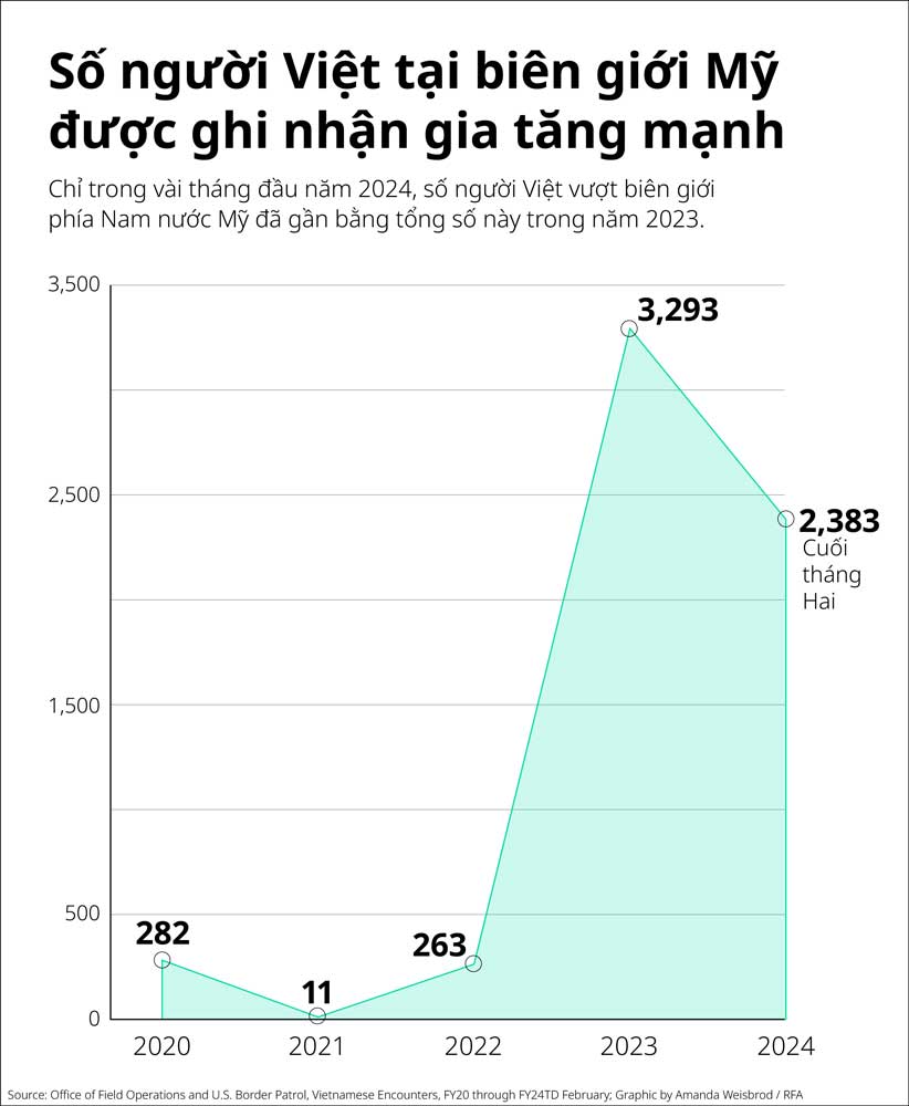 Số liệu từ Cơ quan Hải quan và Bảo vệ Biên giới (CBP) của Mỹ gửi cho RFA cho thấy từ tháng 10/2022 đến tháng 10/2023, có gần 3.300 người Việt Nam vượt biên bằng đường bộ dọc biên giới phía Tây Nam nước Mỹ. Từ tháng 10/2023 cho đến hết tháng 2/2024, con số này là 2.400 người.